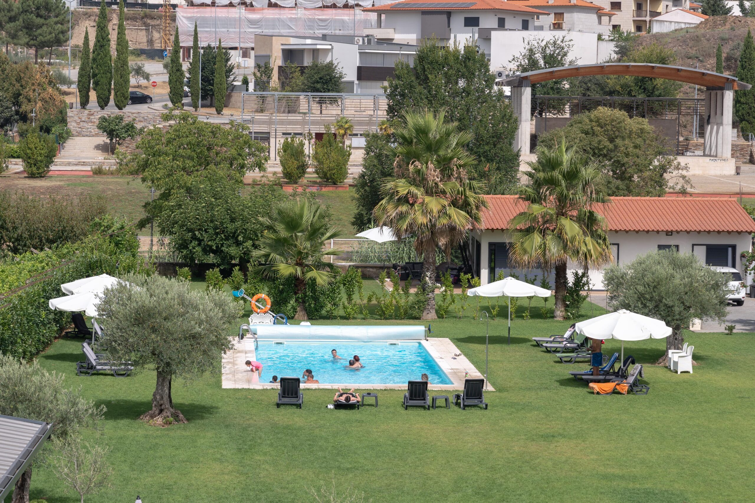 No jardim, o verde impera, área relvada e piscina, churrasqueiras, baloiços e áreas de lazer e descanso.